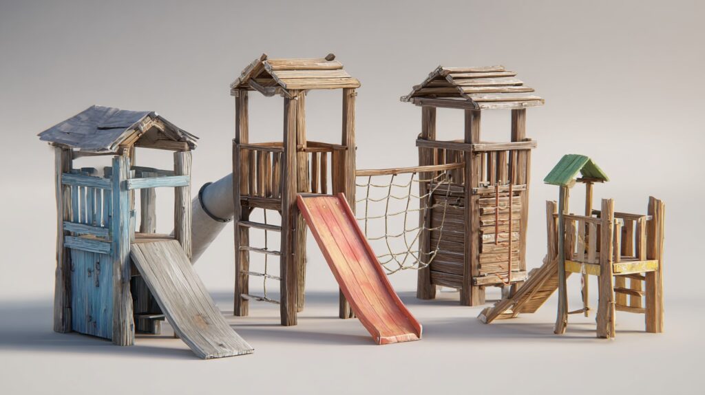 Viele Klettergerüste sind als Spielhäuser, Burgen oder Piratenschiffe gestaltet. Solche fantasievollen Designs regen die Kreativität an und laden zu Rollenspielen ein [2][4]. Ein Spielhaus mit Fensterläden, Veranda oder Geheimgang wird schnell zur Bühne für Abenteuer und Geschichten.