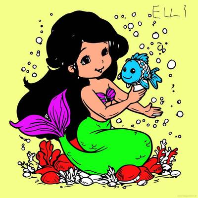 Eine fröhliche Meerjungfrau, die einen Fisch hält, umgeben von Blasen und Unterwasserpflanzen.