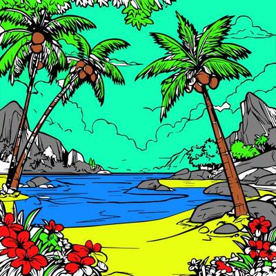 Eine detaillierte Schwarz-Weiß-Ausmalseite eines tropischen Strandes mit Palmen und Blumen.